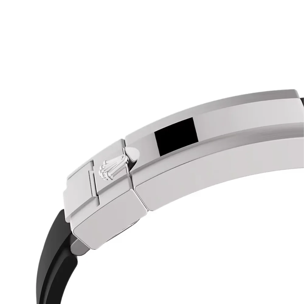 Developed and patented by Rolex, the Oysterflex bracelet combines the strength of metal with the comfort of elastomer. Featuring flexible metal blades encased in high-performance elastomer, cushioned inner supports, and a Glidelock extension, it offers exceptional durability and comfort.
